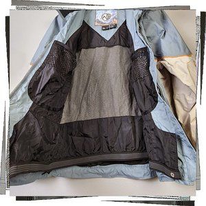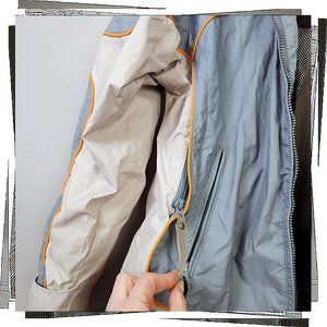 Vintage 1996 lightweight blue and cream with orange pipping accent ski / snowboard jacket plus gator and vent zips. I wore this a bunch boarding in the late 90's. Great for days when it's not super cold as it's more of a shell