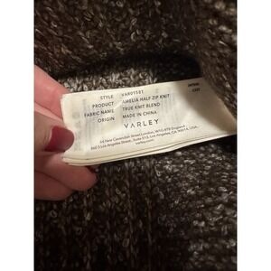 Varley Amelia Half Zip sweater in size small, finished in the rich brown "Coffee Bean" colorway. This elevated knit pullover features a structured half-zip neckline and a cozy, substantial feel that works effortlessly for everyday wear, travel, or lounging. The silhouette is timeless and minimal with an understated, polished look that pairs well with denim, trousers, or activewear-inspired outfits. Condition is excellent with only a small makeup mark on the interior Varley tag that does not affect wear or appearance. Colors may vary in person and may look different due to lighting.