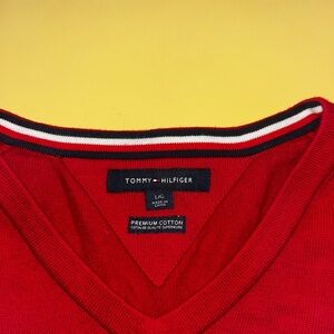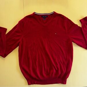 Stylish V-neck sweater by Tommy Hilfiger. Vibrant red color. Ideal for versatile wear.