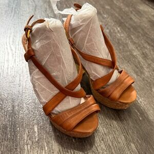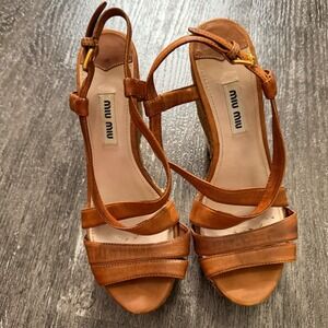 Miu Miu Brown Leather Espadrille Wedge Sandals Gold Accent Heel 34.5 EU / 4.5 US