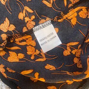 Princess Polly black slip midi dress with burnt orange floral print and side slit. Lightweight, flattering, and perfect for fall outfits.