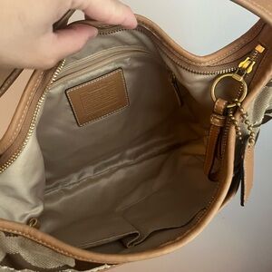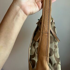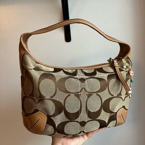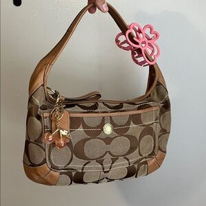Elegant Coach hobo bag with signature pattern. Brown and tan colors. Ideal for everyday use. Has minor minor wear on her bottom corner and some tiny marks on the inside ( all pictured, check all pictures thoroughly before purchase). Beautiful brown everyday bag. Hair clip and and cherry charm with be included