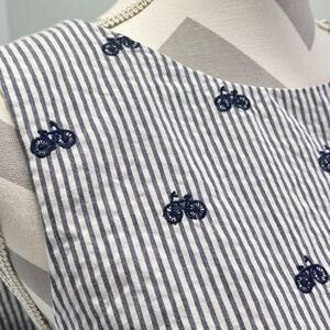 Charming sleeveless dress featuring a delightful navy blue bicycle print on a classic seersucker background. This sheath dress has a flattering silhouette, perfect for warm weather occasions. The dress is fully lined and features a round neckline and a back zipper. The scalloped hem adds a quirky touch of whimsy. Pair this dress with sandals for a casual daytime look, or dress it up with heels for a garden party or brunch with friends.