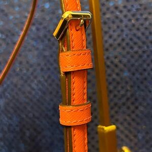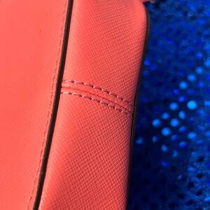 Bright coral crossbody phone case by kate spade. Sleek and stylish design. Saffiano Leather Perfect for adding color to any outfit. There are 3 card slots inside. Exterior back has an open pocket and 2 card slots. The adjustable crossbody strap drop is approx. 29”. NWOT No call-outs. It fits an iPhone 14 Plus and other essentials i.e. keys, money paper, I.D., credit cards etc.