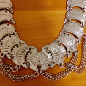 This elegant silver necklace features intricate chain detailing, perfect for adding a touch of sophistication to any outfit.