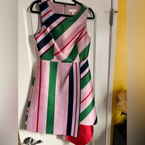 Chic asymmetrical dress with bold green and pink stripes. Stylish and modern design by Ted Baker.