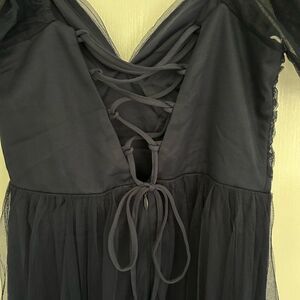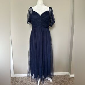 Lulus Glorious Chicness Navy Tulle Pleated Puff Sleeve Midi Dress Medium New