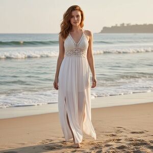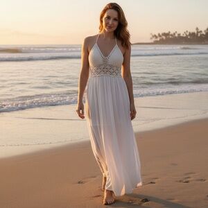 White crochet halter maxi dress featuring a hand-knit crochet bodice with scalloped trim and an open tie-back design, flowing into a lightweight chiffon-style skirt with a boho beach-goddess vibe.