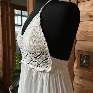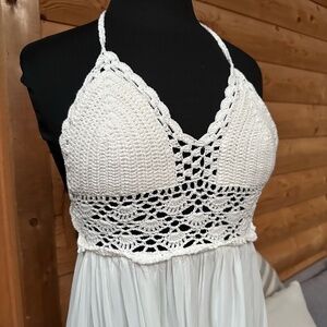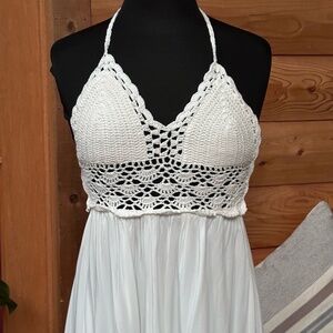 White Crochet Halter Maxi Dress Boho Beach Lace Knit Top Flowy Skirt Small/Med