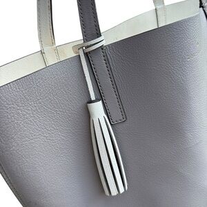 Chic and functional Kate Spade New York tote bag in a soft gray pebbled leather with cream interior and matching tassel accent. Perfect for work, errands, or travel with its spacious open interior and long shoulder straps.