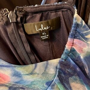 Lulus Bloom Blue Floral Organza Open Back Maxi Dress with criss-cross adjustable straps and hidden zipper at back waist. Lined. Beautiful feminine dress! Excellent preowned condition.