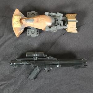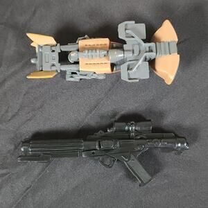 Lot of two Star Wars toy accessories: a 1996 Imperial blaster and a 2001 LFL Hasbro speeder bike section. Both are in used condition with some surface wear from play and storage. Great for completing vintage action figure sets or use as parts for display or customizing.