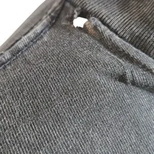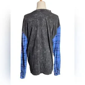 Furst of a Kind black distressed tee with Attached flannel blue sleeves. Graphics have some light cracking and small hole near neck. Has stretch with button cuffs. Super unique. No size or fabric tag Relaxed fit