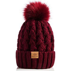 Women’s Wine Red Winter Ribbed Beanie Hat Chunky Cable Knit Pompom Warm