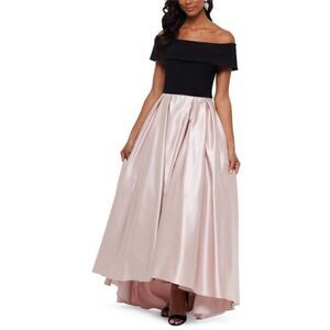 Betsy & Adam NWT Womens Beige Off-the-Shoulder Satin Ballgown Evening Dress