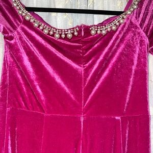 Step out in style with this elegant velvet dress. Featuring a rich pink hue, this long sleeve dress is perfect for any special occasion. Its luxurious fabric and flattering fit make it a must-have addition to your wardrobe.