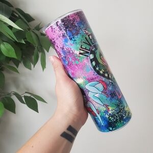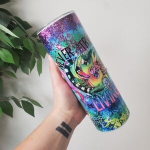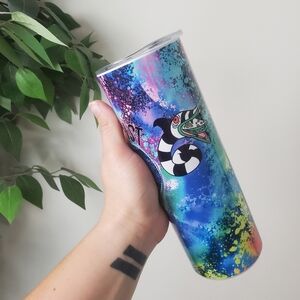 Vibrant tumbler featuring a unique graphic design. Perfect for adding a splash of color to your drinkware collection. NOT Beetlejuice branded.