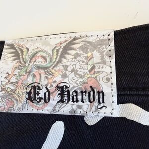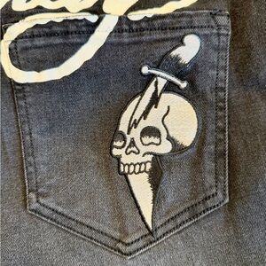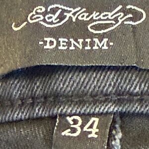 denim, brand logo, washed black denim, high rise, tapered leg, skinny fit, zipped placket w top button closing, five pockets, Back side pocket adorned with Ed Hardy signature. Back pocket embroidered Skull scene , back colorful patch on waistband