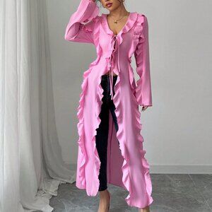 Elevate your wardrobe with this elegant pink blouse, featuring a casual design, long sleeves, and a stylish ruffle detail. It has a regular fit, asymmetrical hem, and a v-neck for a comfortable and chic look.