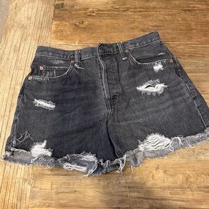 Trendy charcoal jean shorts with a distressed look. Perfect for casual wear. Features frayed hems and ripped details.