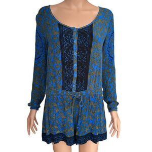 Free People Resort Romper in Electric Blue Floral Long Sleeve Blouson Size XS