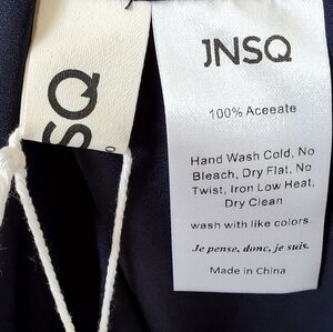 JNSQ Dark Navy Super Silky Soft Midi Dress. Buttons go down front. Button Sleeves. Lined. Pleats. Across chest is 17.5"inches. Length top to bottom is 51"inches. 100% Cellulose. Pleats throughtour Dress and Sleeves. Size 10. Women. NWT. MSRP $129.00