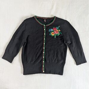 VTG Y2K Lucky Brand Black Embroidered Floral Button Up Cardigan Sweater Womens M