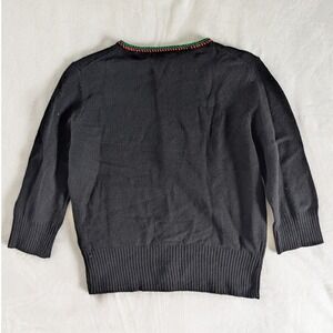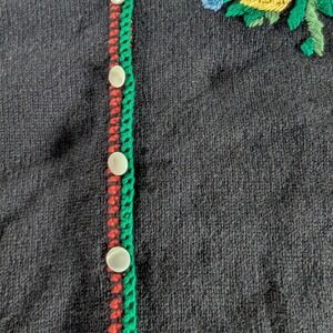 This is an adorable Vtg Y2K Lucky Brand black cardigan sweater with beautiful floral embroidery on the chest and contrasting red and green trim and ribbed cuffs and hem.