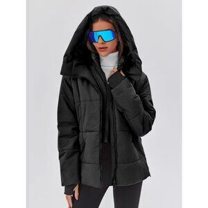 Women's Black Quilted Puffy Ski Jacket Belt Coat Hooded Mountain Winter Snow