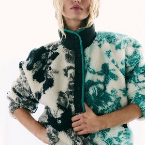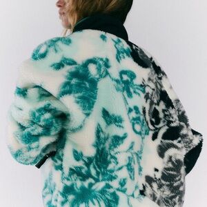 Cozy teddy jacket with bold black and teal patterns. Soft and stylish for any casual outing. Never worn new without tag just too big on my frame
