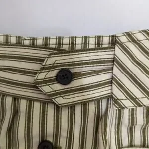 Green and cream linen (77% Tencel lyocell, 23% Organic cotton). Skirt. Exposed front button down placket. Front pockets. 19" from waist to hemline. Imported.