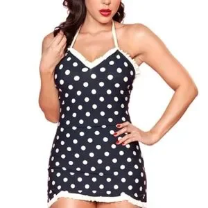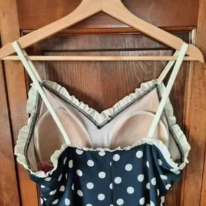 Bettie Page Retro Polka Dot Ruffle Trim One Piece Swim Dress Navy Blue Size 16W