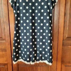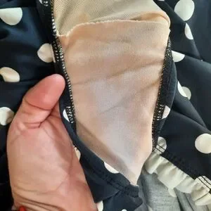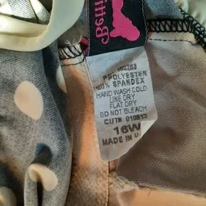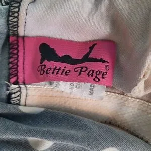 Bettie Page Retro Polka Dot Ruffle Trim One Piece Swim Dress Navy Blue Size 16W. Pull-on style swim dress with Sweetheart v-neckline, all-over polka dot pattern, white ruffle trim, built-in padded cups, flirty swim dress length, mesh lined front interior, and full under suit. The interior mesh lining and crotch have been discolored from either spray tan or self tanner, shown in pictures. Otherwise, it's in great condition! Made in USA. Quick dry material 80% polyester 20% spandex. Size 16W.