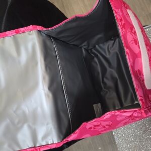 Charming pink tote with skulls design. Betsey Johnson branding on front.