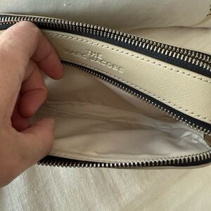Stylish Marc Jacobs crossbody bag in beige. Features gold hardware and a sleek design. Perfect for any outfit.