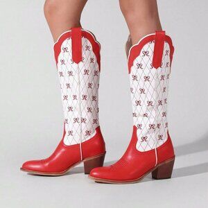 Red Chic Women's Knee High Cowboy Boots with Chunky Heel