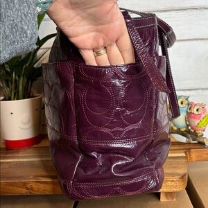 Stylish Coach Diaper bag in a deep purple shade. Features a glossy finish and signature logo detail. A few scuffs shown in pics and a few spots inside, also shown in pics. I used as a gym bag.