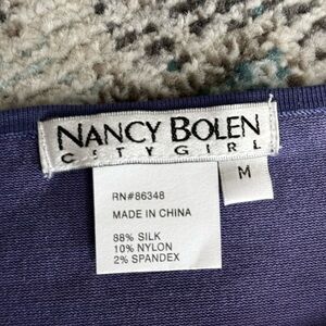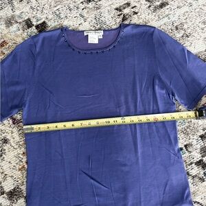 In like new condition. No signs of wear. Beaded embellishments at the neckline. Silk blend. Color is a purplish blue or bluish purple.