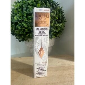 Unveiling Charlotte Tilbury's Beautiful Skin Foundation, a medium coverage, light-as-air formula designed to hydrate and brighten. Infused with hyaluronic acid and brightening rose complex, this foundation makes skin look more beautiful instantly and over time, promising a healthy-looking, glowing, and smoother complexion. Clinically proven results show boosted hydration by up to 166%, plumper and smoother skin by up to 181%, and more even skin tone by up to 210%. Over 99% of users agree it minimizes the appearance of pores, reduces the appearance of imperfection and dark spots, and smooths skin instantly. Perfect for everyday wear, special occasions, or whenever you want to achieve a radiant and flawless complexion.