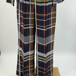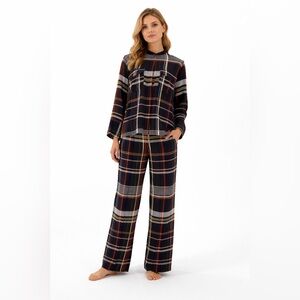 Elevate your everyday style with this sophisticated plaid two-piece set. Featuring a long-sleeve button-front top paired with matching straight-leg pants, this set blends effortless comfort with polished elegance. The classic plaid pattern in rich navy, warm rust, soft gray, and ivory tones creates a timeless look that transitions seamlessly from day to evening.
