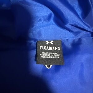 The Under Armour Boys Pronto Colorblock Hood Lightweight Puffer Jacket in YLarge is a stylish and practical outerwear option for boys. Made with 100% Nylon outer shell material and blended fabric, this jacket is water repellent and features a full-zip closure, hood, and pockets. The mid-weight warmth and mid-length design make it suitable for winter, fall, and spring seasons. The jacket's colorful Team Royal Colorblock pattern and quilted accents add a fun and sporty touch, perfect for various activities such as riding, walking, or running. Easy to care for with machine washable instructions, this jacket from the Under Armour Pronto line is a versatile addition to any boy's wardrobe.