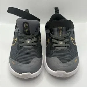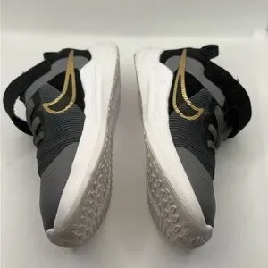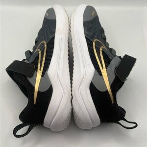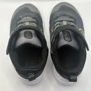 Nike sneakers with black base and gold swoosh. Comfortable, easy slip on, velcro closure and stylish for kids.