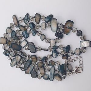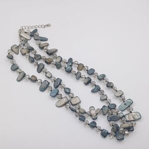 This stunning 2 strand necklace features a blend of dusky blue Mother of Pearl chips and clear glass crystal beads all hand tied, perfect for adding a touch of nature's beauty to any outfit. The contrast between the dark MOP and the glitter from the clear faceted glass crystals makes this a stunner. It measures 18.5 to 21 inches.. N76