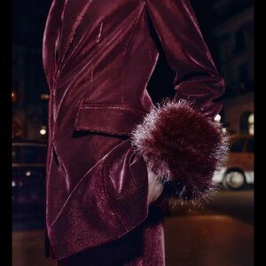 Luxurious velvet blazer in rich burgundy. Features plush fur cuffs. Perfect for elegant occasions.