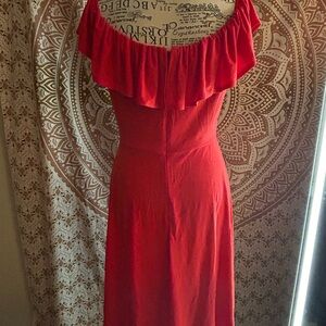 Chic red midi dress with ruffle neckline. Perfect for any occasion. Flattering and stylish design.