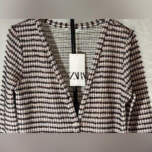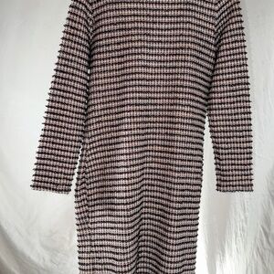 Stylish Zara knit with black and white stripes. Soft and comfortable fabric.Zara Tweed v-neck Cardigan Dress pink and black colored button front two front pockets NWT Size Small 41 inches from shoulder to bottom hem. The last few photos show the actual color.