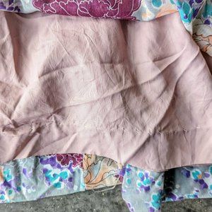 Vintage dress in great pre-loved condition! Gorgeous purple, blue, and orange floral pattern. Short sleeves, ruffles on the neckline, maxi length, empire waist with tie belt, full lining, and zipper down the back. International Ladies Garment Workers Union / ILGWU. Made in USA. Exact decade is unknown, but it has a very 1970s boho hippie vibe. No brand tag, care tag is faded. Size 13--fits like a modern small. 18.5" pit to pit 15" waist, 54" length. There is some minor pilling in the armpits, and some wear to the lining. Cover photo accessories not included. No trades. No modeling. Make a reasonable offer. Thanks!