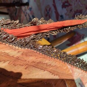From the souks of Cairo over 24 years ago: a bronze beaded hip scarf on chiffon tie- dye fabric in pristine condition. Whether u shimmy as a belly dancer or just want to add a little mystery to some outfit that needs a little boost, or need to complete a costume, this is your answer. Much classier than the coin hip scarves. Triangle shape measure 53" at long end and 23" deep. From smoke and pet free home