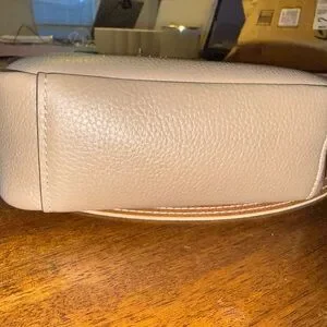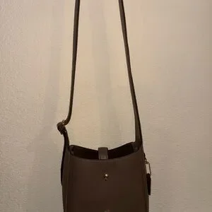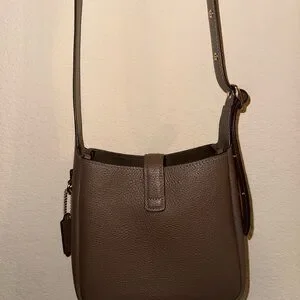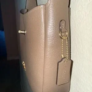 Elegant Coach shoulder bag in gray leather. Sleek design with gold accents. Perfect for everyday use. More taupe than tan