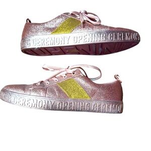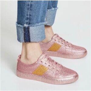 Elevate your style with these glittery Opening Ceremony La Cienega sneakers. Features pink sparkle with gold stripe detail. Ideal for a trendy look.